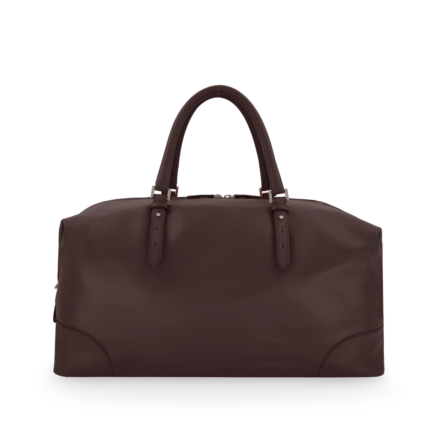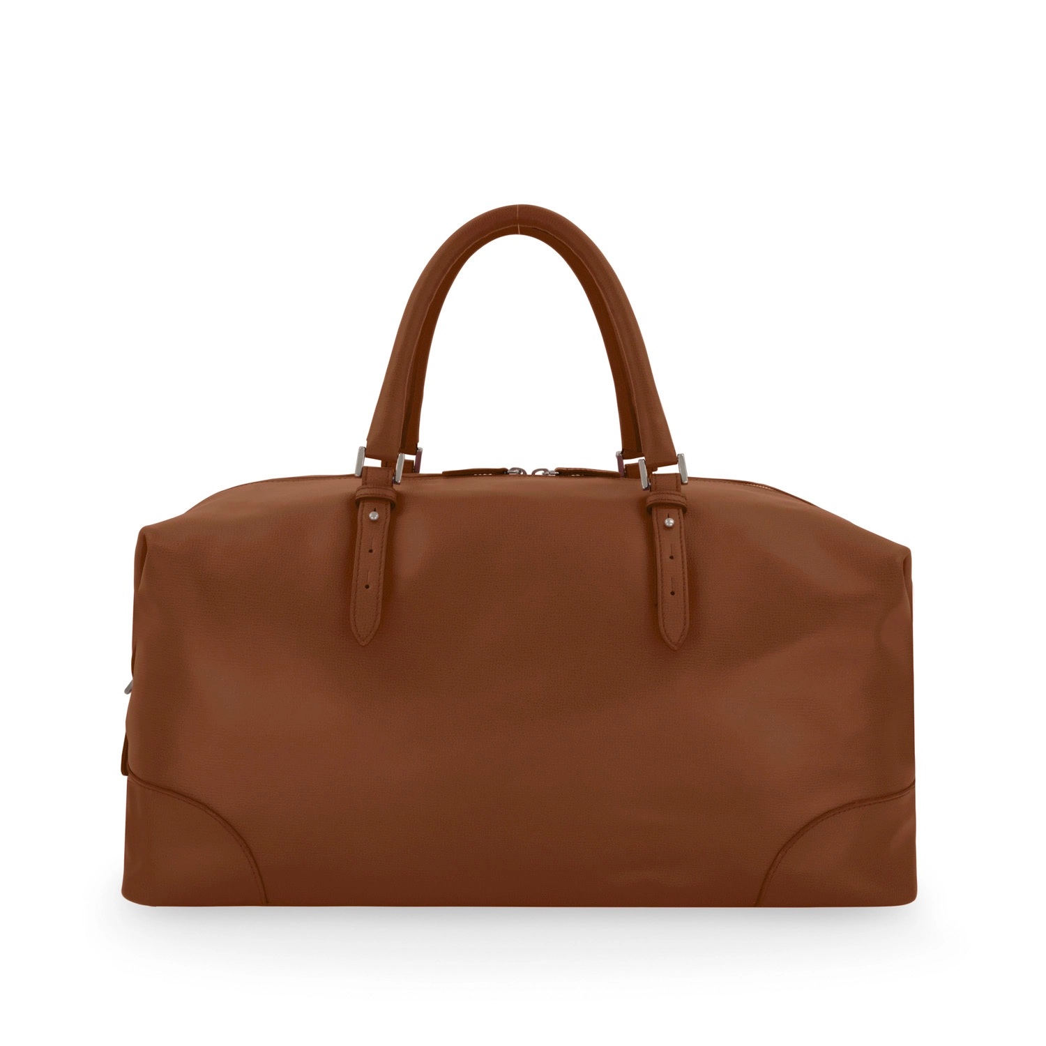 Borsone da viaggio con orecchie fissate ai lati e staccabile all’occorrenza per ottenere maggiore capienza, con manici regolabili in altezza, con chiusura a zip e tracolla separabile, con tasca interna chiusa con zip realizzata interamente in Italia in pelle vitello grana Cervo di alta qualità. Personalizzabile con stampa a caldo o a secco del logo aziendale o delle iniziali oppure a ricamo.