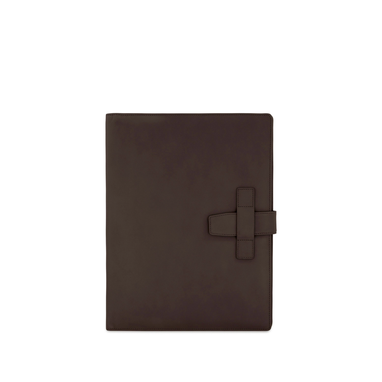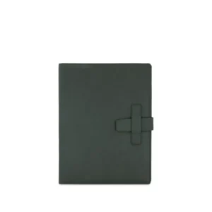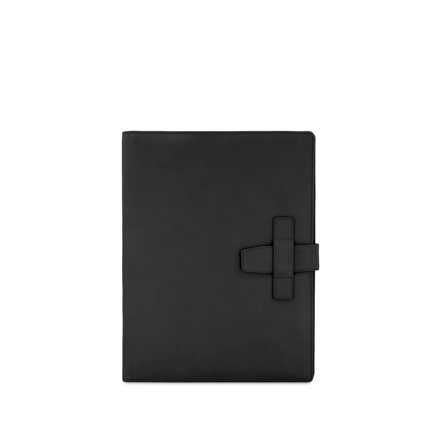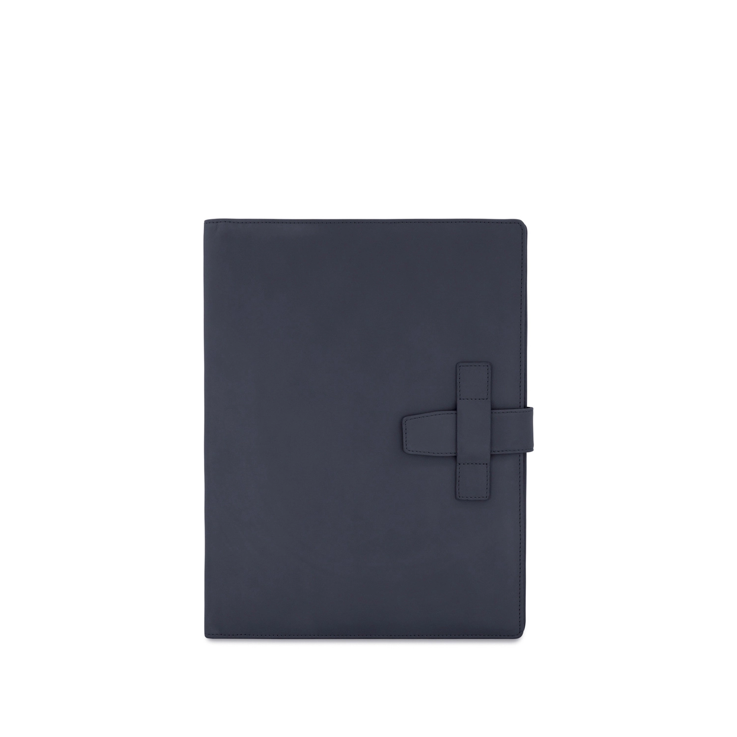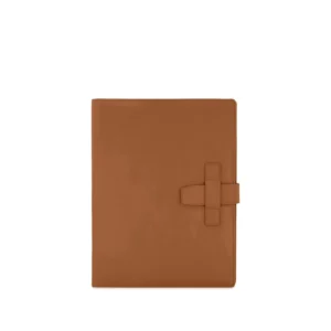 Folder portablocco A4 con chiusura a passante con portapenna e aletta con tasche portadocumenti, porta carte di credito e portabiglietti realizzato interamente in Italia in morbida pelle bovina naturale liscia di alta qualità, rifinito con cucitura a passo fine. Personalizzabile con stampa a caldo o a secco del logo aziendale o delle iniziali.
