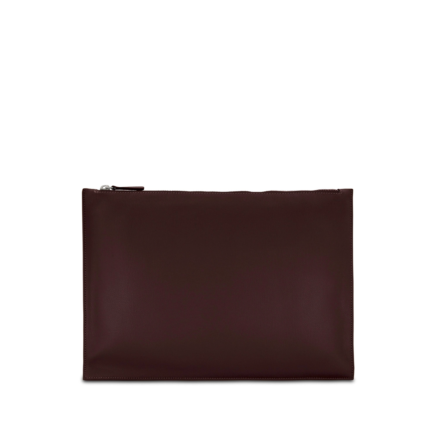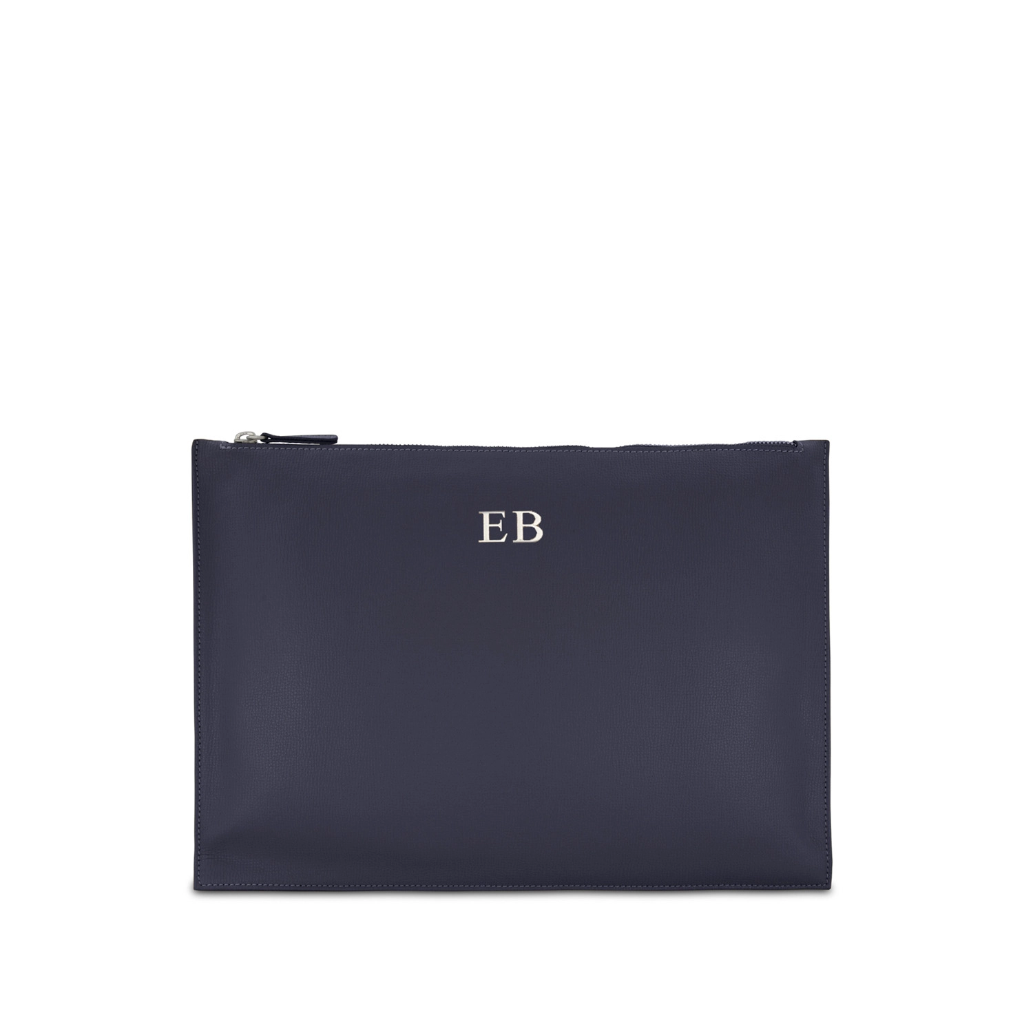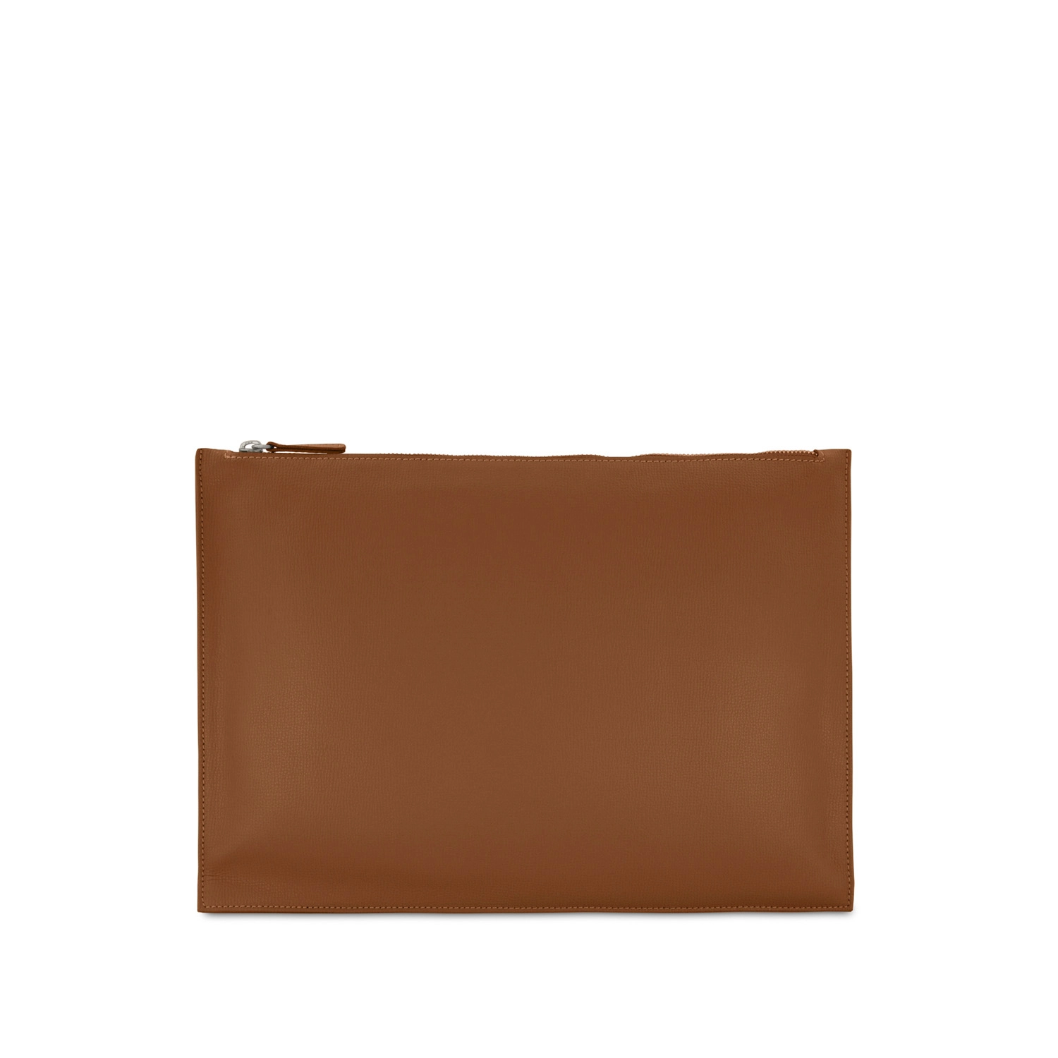 Porta documenti sottobraccio piatto con chiusura a zip in testa realizzata interamente in Italia in pelle vitello grana Cervo di alta qualità, rifinito con cucitura a passo fine. Personalizzabile con stampa a caldo o a secco del logo aziendale o delle iniziali oppure a ricamo.