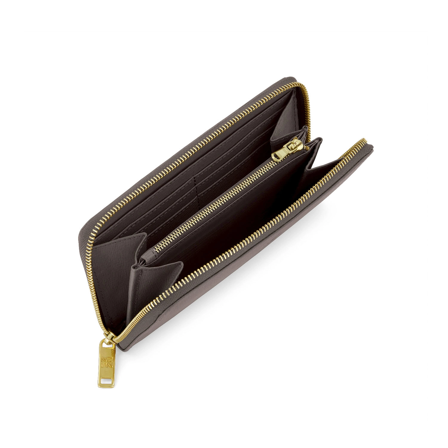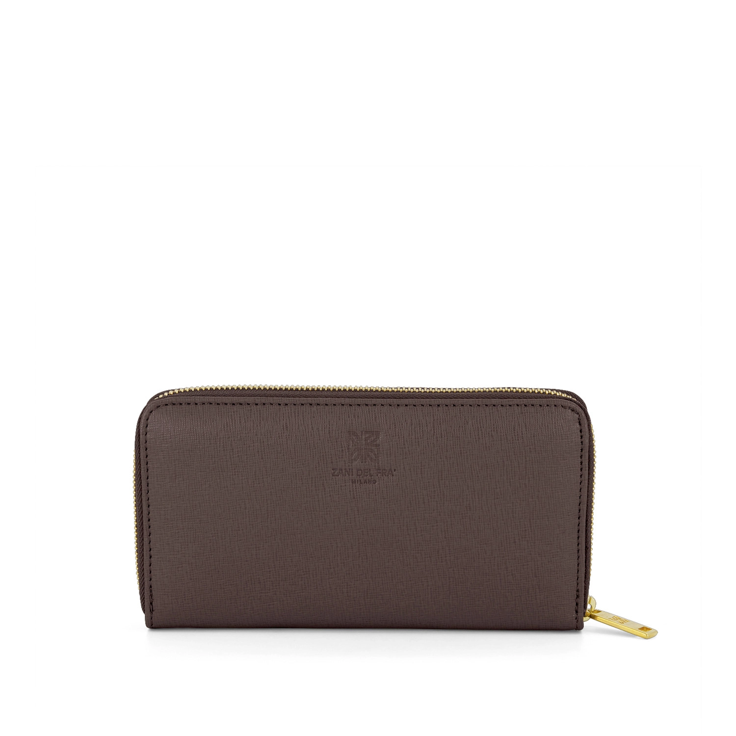 Porta foglio donna orizzontale di dimensioni generose chiusura con zip sui tre lati con tasca interna di tramezza con zip in testa realizzato interamente in Italia in pelle vitello stampa Saffiani di alta qualità, rifinito con cucitura a passo fine. Personalizzabile con stampa a caldo o a secco del logo aziendale o delle iniziali