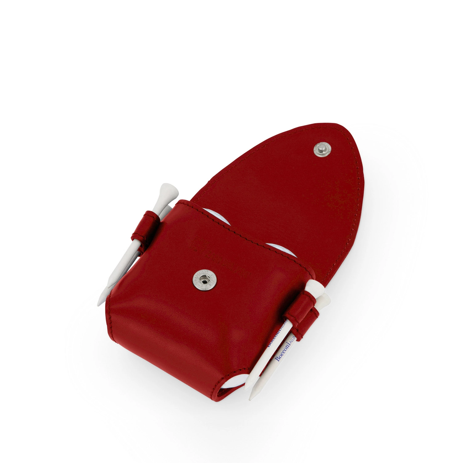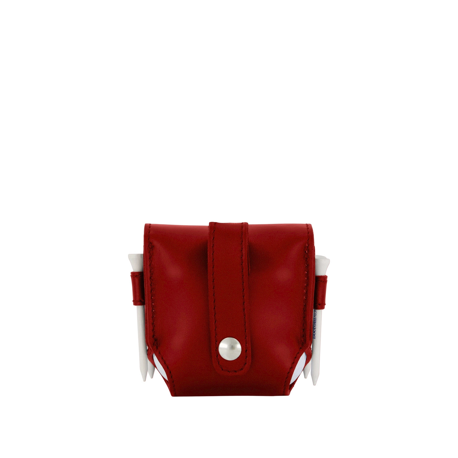 Porta palline da golf per quattro palline e 4 tee con chiusura con bottone a pressione realizzato interamente in Italia in pelle vitello liscia di alta qualità, rifinito con tintura in costa e cucitura a passo fine. Personalizzabile con stampa a caldo o a secco del logo aziendale o delle iniziali.